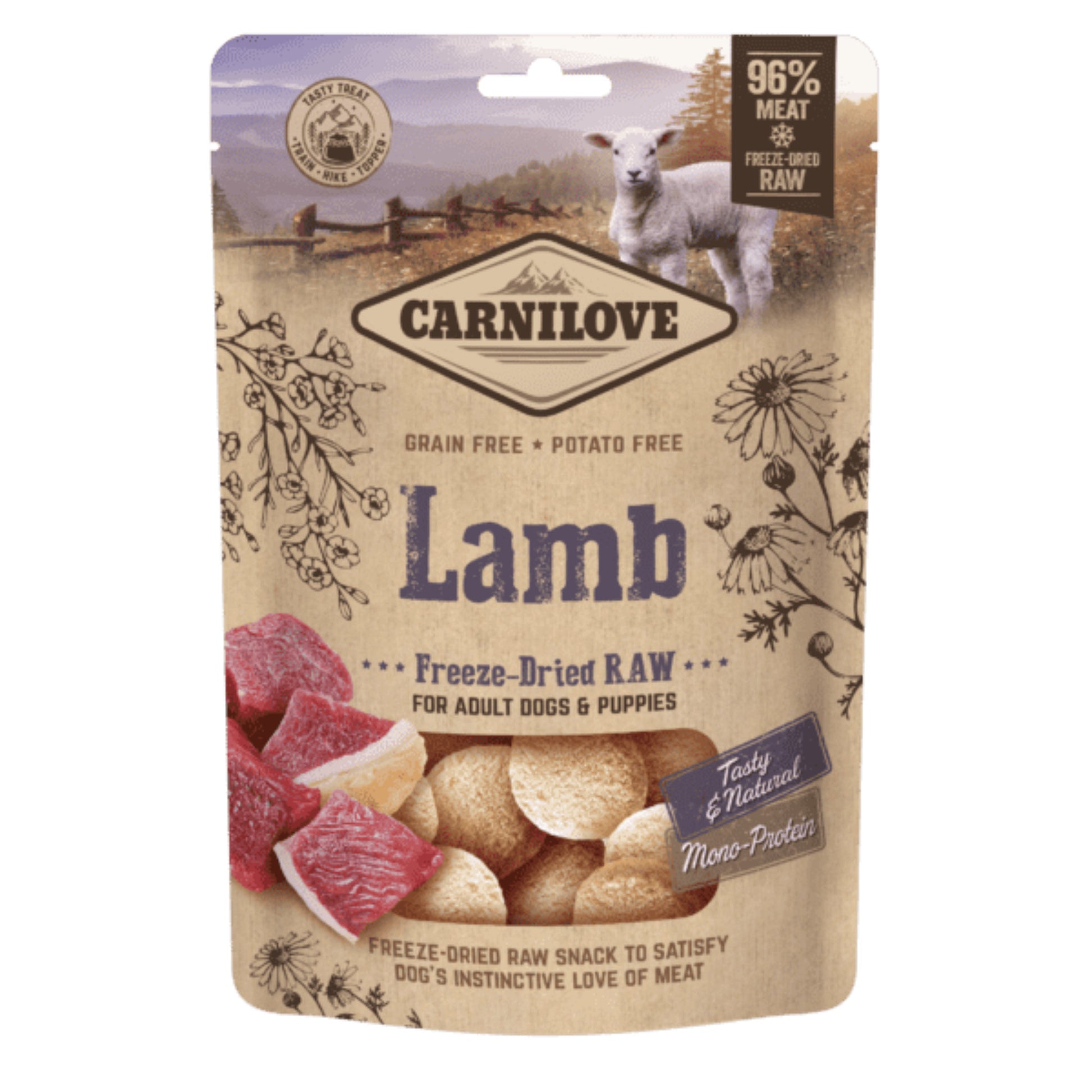 Carnilove Freeze-Dried raw snacks, to satisfy your dog’s instinctive love of meat. Tasty and natural reward, with 96% lamb ingredients. Perfect for high energy adventures, training or even as a complementary topper to your dog’s usual food.