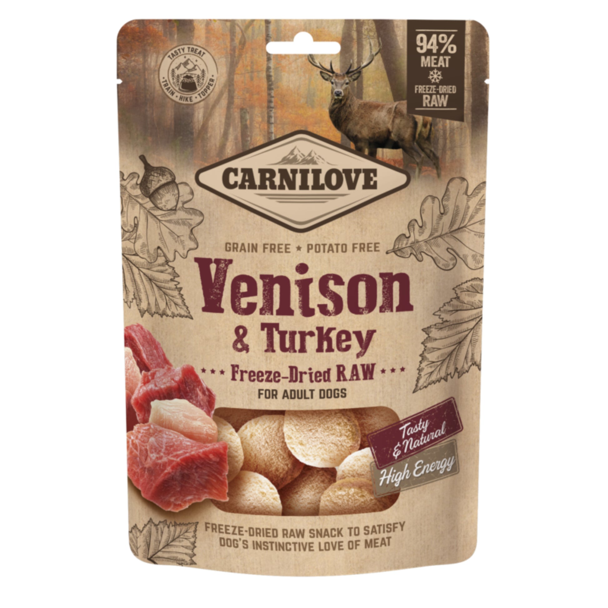 Carnilove Freeze-Dried raw snacks, to satisfy your dog’s instinctive love of meat. Tasty and natural reward, with 94% venison and turkey ingredients. Perfect for high energy adventures, training or even as a complementary topper to your dog’s usual food.