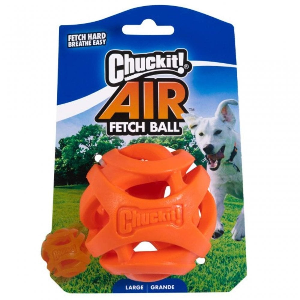Fetch Hard and Breathe Easy with the Chuckit!® Air™ Fetch Ball! This patented; high-performance ball is designed to allow dogs to run farther and fetch longer during playtime.The hollow; mesh-like design facilitates breathing and airflow into the dog's lungs while running and fetching. Great for playing near a pool or other body of water since it also floats. Made from durable material; the Chuckit! Air Fetch Ball is lightweight and easy to grab. It also helps keep dogs active and healthy as it promotes exercise and activity. Great for dogs that may tend to get bored easily. Compatible with Chuckit! Large Launchers. Multiple sizes available for dogs of all breeds and sizes.