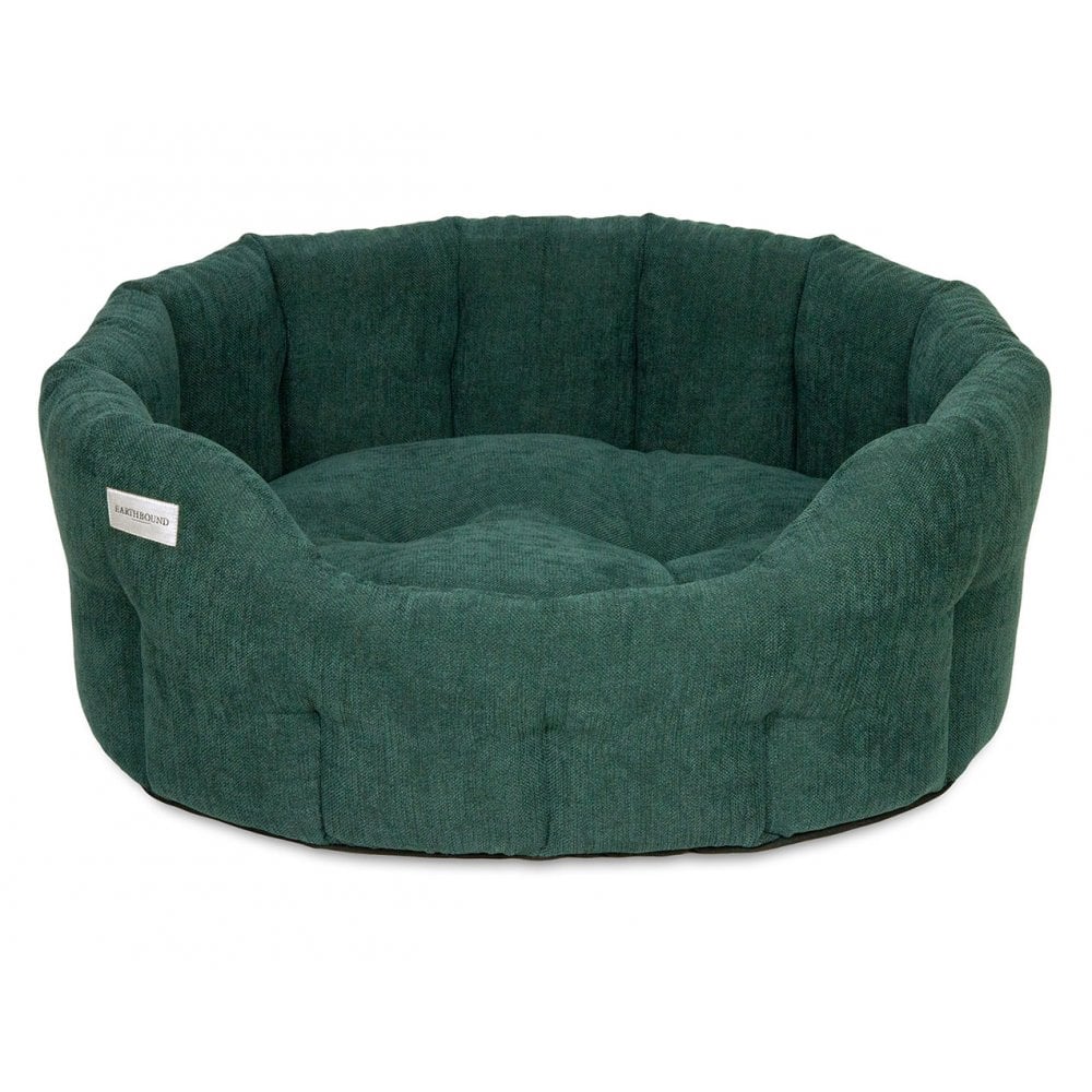 The Classic Round Orkney Dog Bed is made with a finely textured upholstery material that feels luxuriously soft to the touch. This plush chenille fabric features a dual-tone with subtle variations in hue, creating a visually rich appearance. Its raised, velvety surface retains warmth, providing an exceptionally cosy and inviting feel.