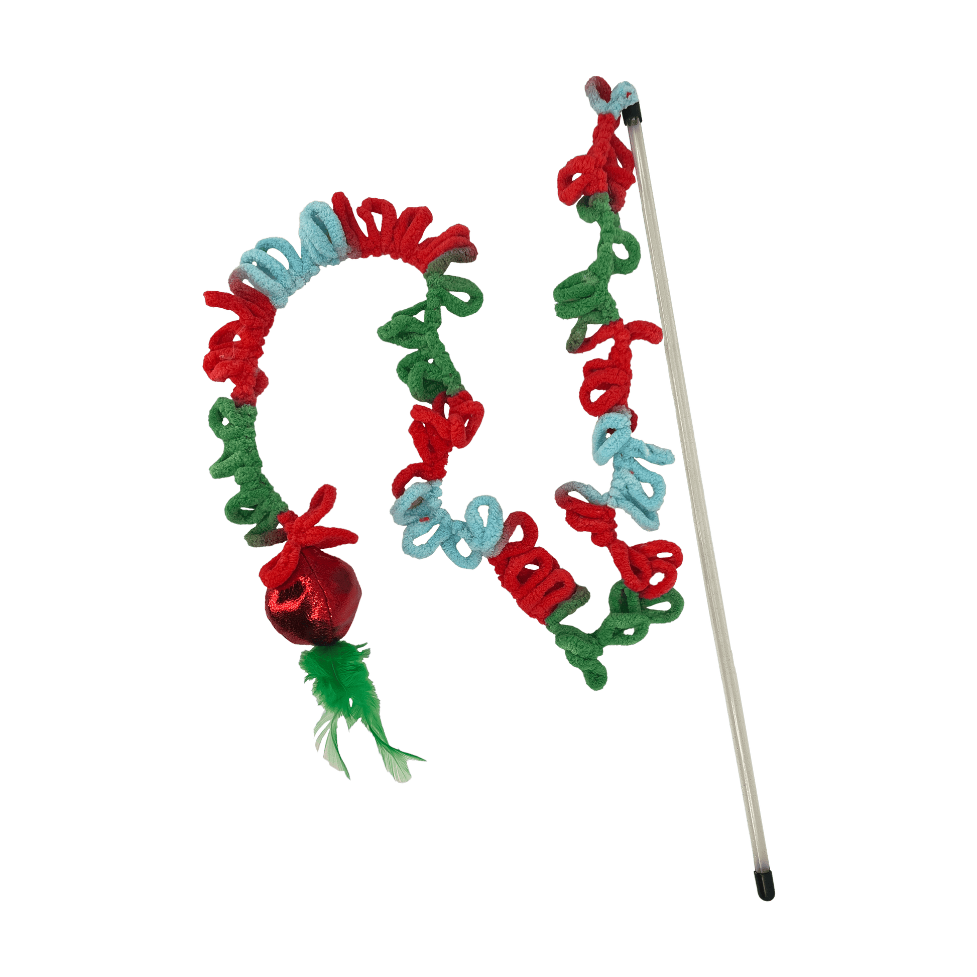 KONG Holiday Teaser Loopz has an extra-long wand and soft yarn rings that satisfy hunt-and-capture instincts in a dynamic rainbow of holiday color. The chunky yarn rings provide a fulfilling reward while meeting stalking needs. A shiny ball and fluttery feathers give kitties an exciting visual target for pouncing while the ball’s crackling sound keeps cats interested. KONG North American Premium Catnip in the ball boosts mood, keeping kitties playing longer.