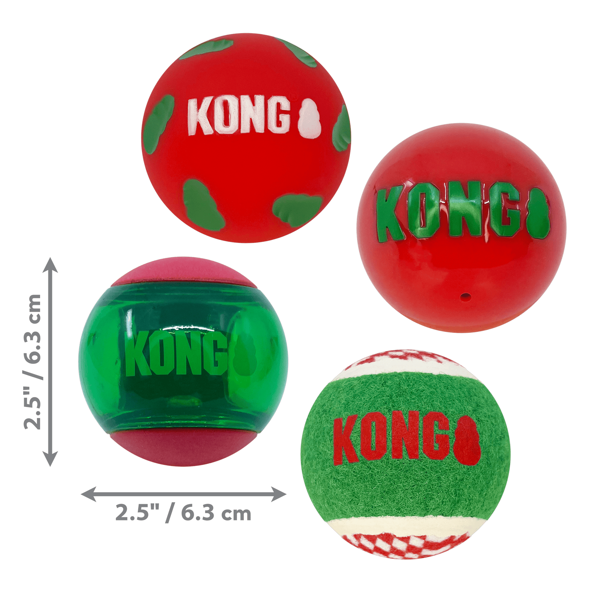 KONG Holiday Occasions Balls 4-pack delivers four merry versions of our Signature Balls, each with a unique texture for high-flying variety to keep pups playing. These super-sturdy, ultra-bouncy balls offer long-lasting action, satisfying dogs’ chasing and retrieving instincts with tons of healthy exercise. Some squeak, some do not, and they all are decked out for the holidays! Special felt on the KONG Signature Sport Ball is gentler on teeth and gums than regular tennis balls for safer play.