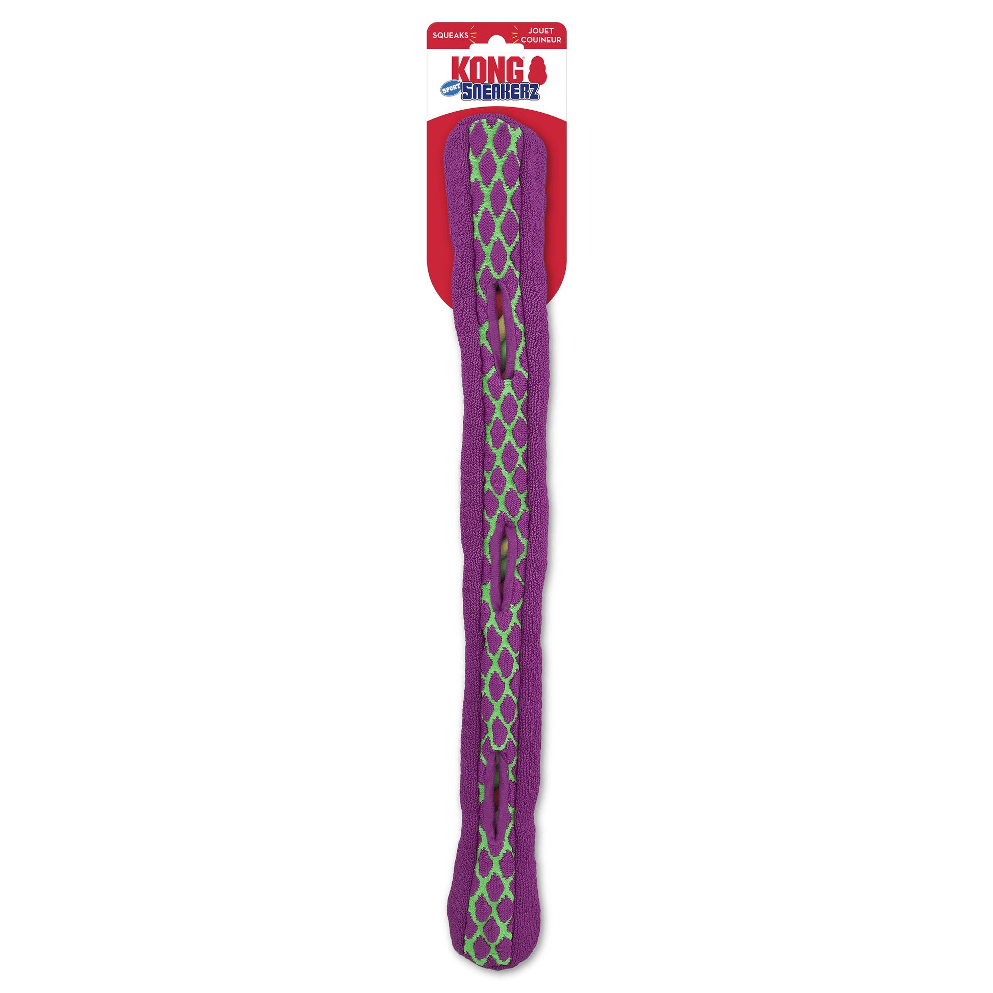 KONG Sneakerz Sport features a textured tennis shoe material that provides durability for long-lasting runs of fun. The grippy toy features peek-a-boo windows that pique foraging instincts while the internal twisted rope rewards chewing needs. The 20” long stick shape is ideal for interactive tugging sessions and the multiple squeakers are sure to extend playtime.
